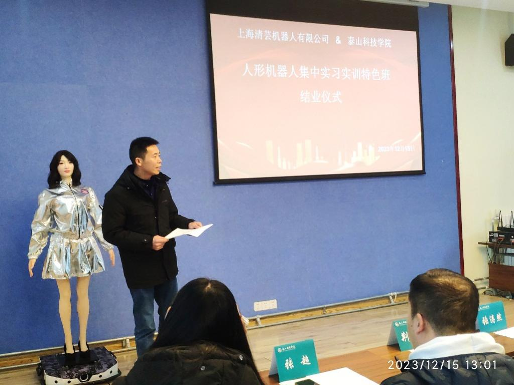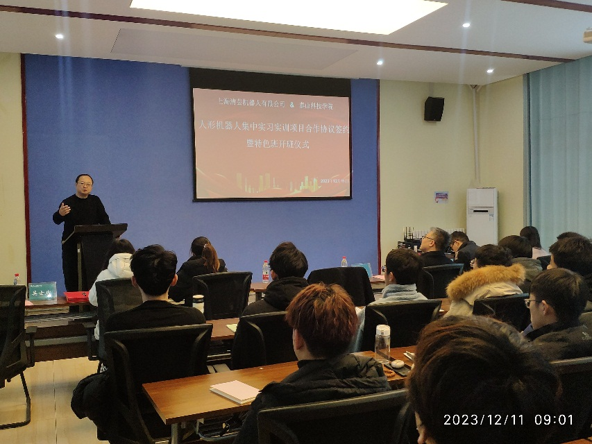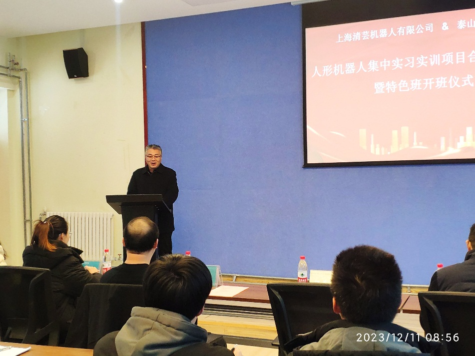 随后,清芸董事长王磊介绍了此次特色班的培训内容,希望员工们通过本次特色班能全面了解人形机器人的基础知识、核心技术及应用,为后续的学习和实践打下坚实的基础。最后,王磊董事长表示该行业目前人才紧缺,希望能与学校加强合作,携手培养更多适应国家需要的创新型、应用型机器人行业人才,共同推动人形机器人领域的发展。