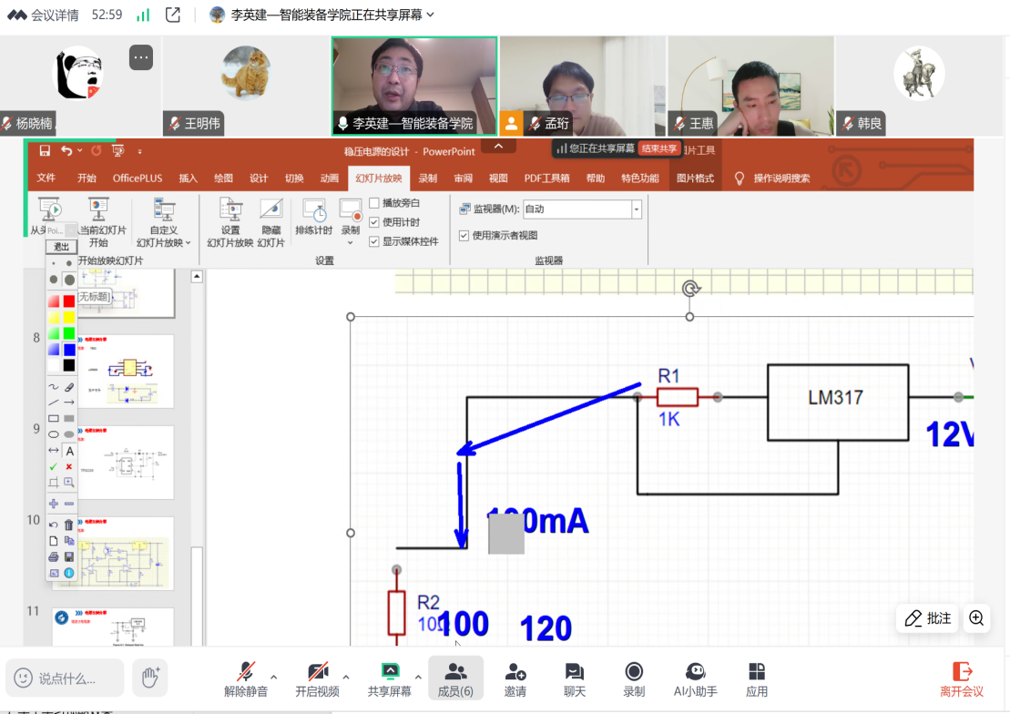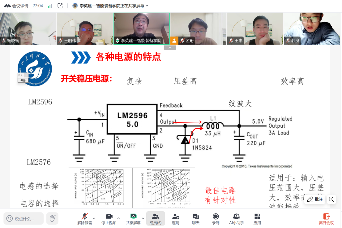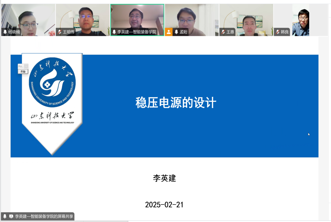 为夯实青年教师理论水平,提高青年教师科研能力,帮助青年教师科研教学融合式发展,以进一步提升青年教师公司产品质量及促进青年教师自我成长。2月21日,青年教师成长导师李英建教授通过腾讯会议,为304am永利集团王明伟、孟珩、杨晓楠、王惠、韩良五位电气青年教师开展了关于“稳压电源设计”的主题会议。